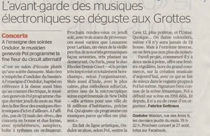 Pareil projet, commencé il y a deux mois à peine, offre une fenêtre régulière, hors du grand commerce, sur la création musicale d'aujourd'hui, avec ce qui se fait de mieux dans le registre propre à POL lui-même. Signature bien connue de la scène lémanique, POL a débuté surc en 1991 déjà. Et depuis, il n'a eu de cesse d'en organiser.